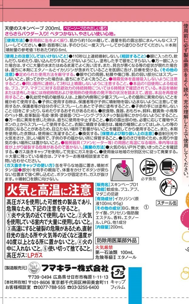 ●乳幼児や肌の敏感な人は、上腕の内側等に少量スプレーし、その箇所に異常のないことを確かめて使用する。